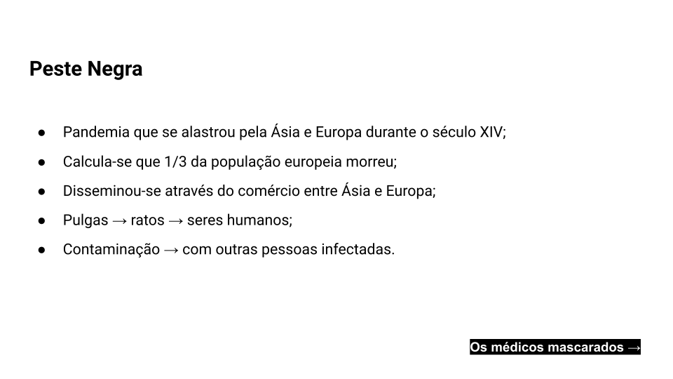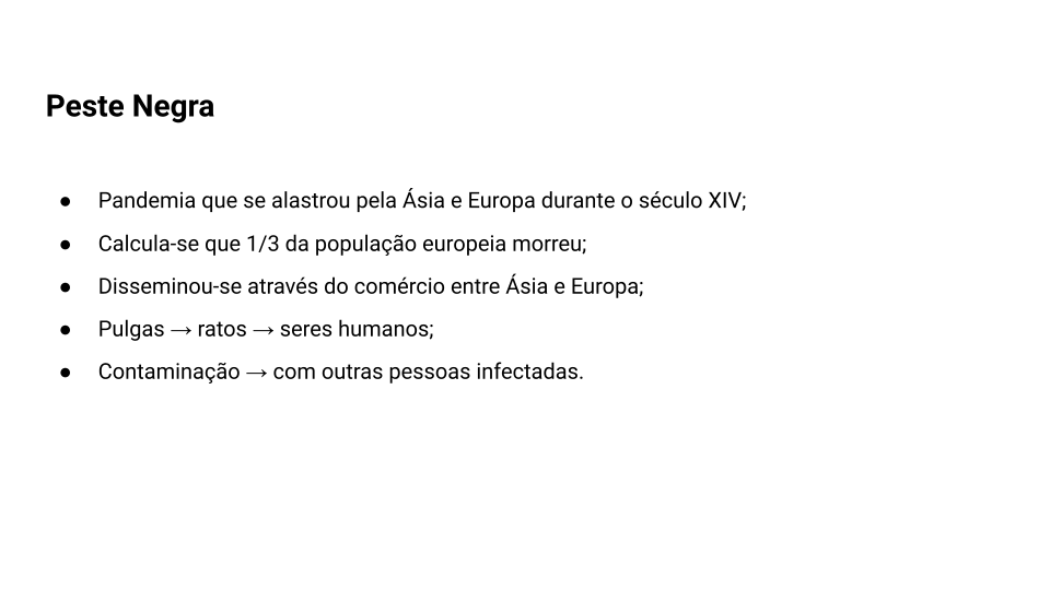 Faça bullet points, fluxogramas, mapas mentais; use setas, desenhos, imagens do processo de apresentação, do raciocínio, do conhecimento que você quer passar. Não coloque textos enormes explicando como ocorre a contaminação da Peste Bubônica, traga um desenho sobre: