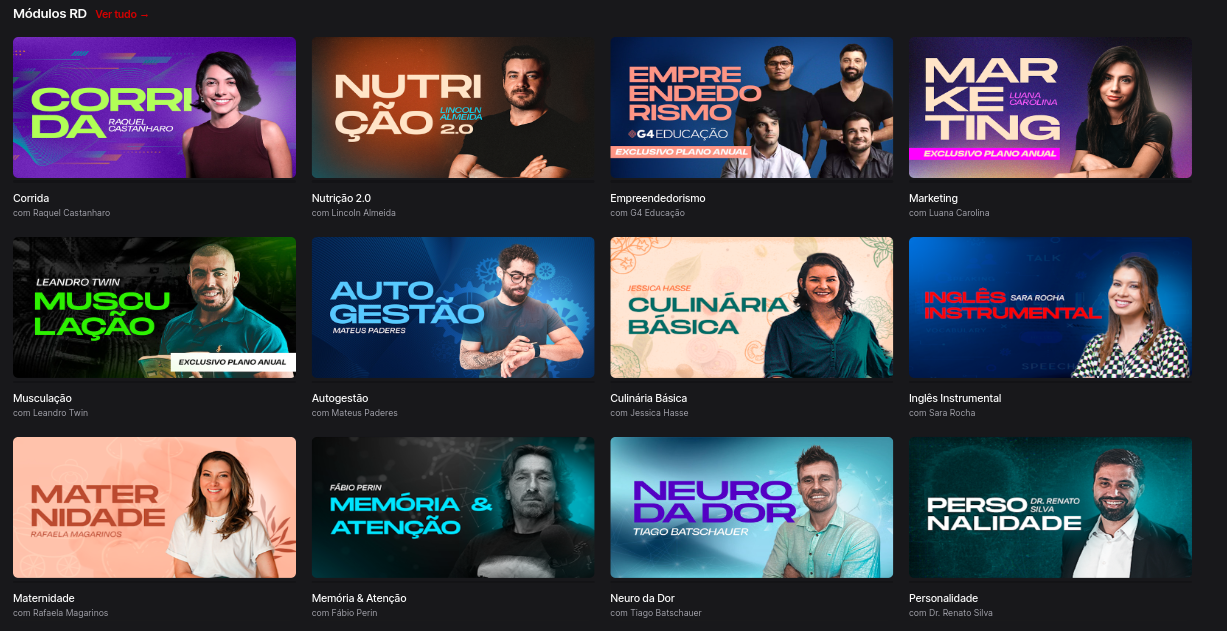 Quer saber mais sobre temas mais específicos como marketing, nutrição, corrida? Lá no RD temos módulos com professores conhecedores dessas áreas. Mais conhecimento para você aplicar no seu dia a dia.