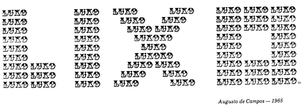 Augusto de Campos produziu esse poema em 1965, época em que o movimento Poesia Concreta era ativo. Para alguns, esse poema pode ser algo muito banal e óbvio: As muitas palavras “luxo” formam a palavra maior “lixo”, talvez isso seja uma crítica ao fato de o luxo gerar muito lixo. Mas preste atenção na utilização da luxuosa fonte tipográfica; esse uso exacerbado gera uma poluição visual, ou seja, LIXO.