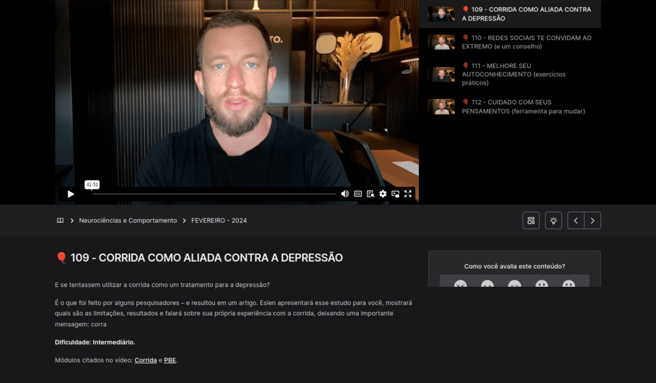 Em uma aula do Reservatório de Dopamina, Eslen destaca uma revisão que analisa vários estudos sobre o uso da corrida na depressão, concluindo que o exercício físico tem um enorme efeito benéfico na saúde mental. Ele também compartilha sua própria experiência com a corrida, enfatizando seus benefícios tanto para a saúde mental quanto física.
