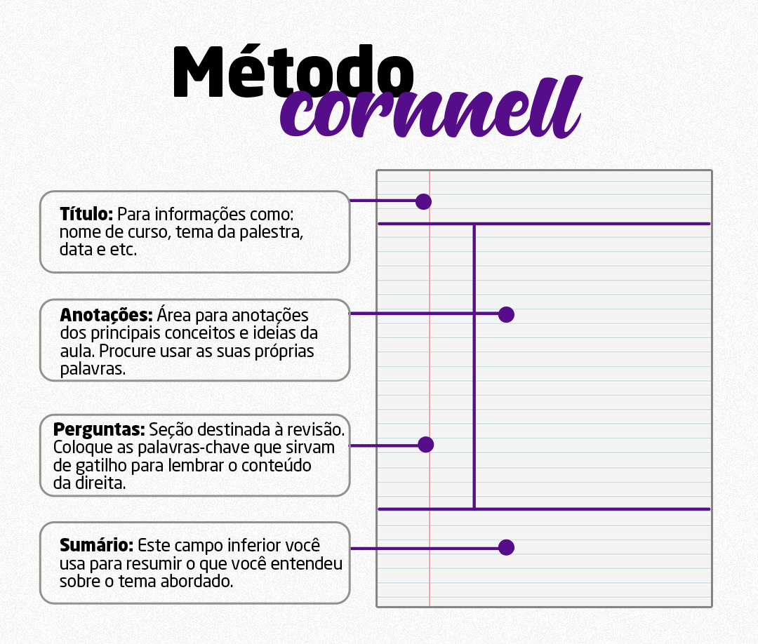 Durante os eventos, é fácil se perder em uma avalanche de informações. Para evitar isso, crie um sistema de anotações organizado. Divida suas anotações em categorias, como “Conceitos principais”, “Exemplos práticos” e “Dúvidas”. Você pode também utilizar um método de anotações chamado Cornell. Para otimizar, vamos colocar um exemplo abaixo: