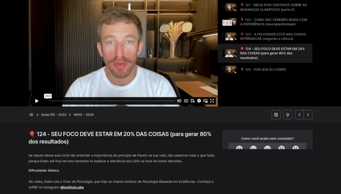 O Princípio de Pareto, ou a regra 80/20, sugere que 80% dos resultados vêm de 20% das causas. Em outras palavras, uma pequena quantidade de ações pode gerar a maior parte dos efeitos desejados. Eslen Delanogare, Doutor em Neurociências, aplica esse princípio em sua vida, incentivando seus alunos a fazerem o mesmo para evitar problemas e alcançar metas com eficiência e fala um pouco sobre em uma aula do Reservatório de Dopamina: